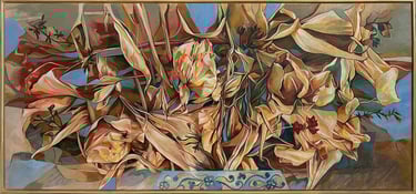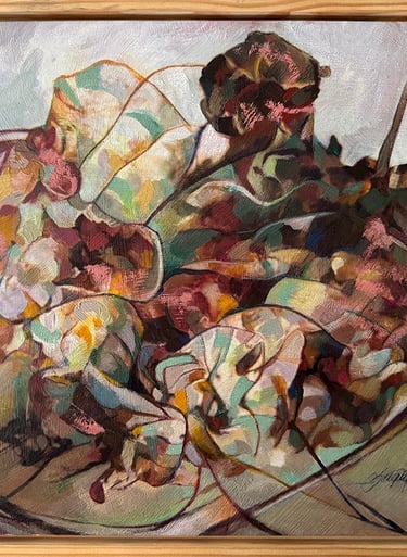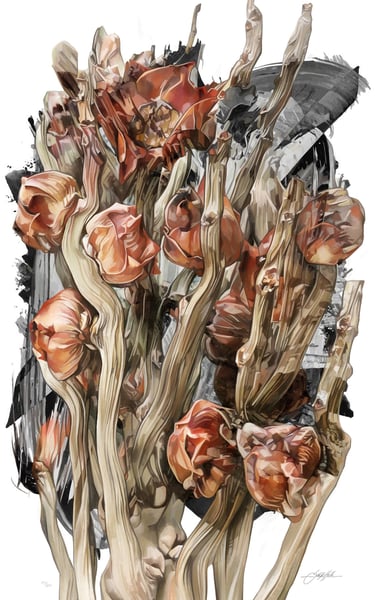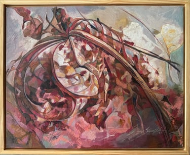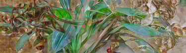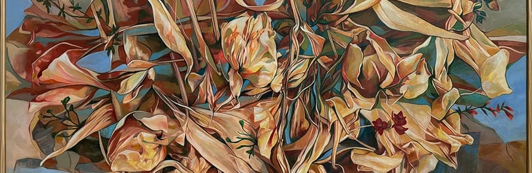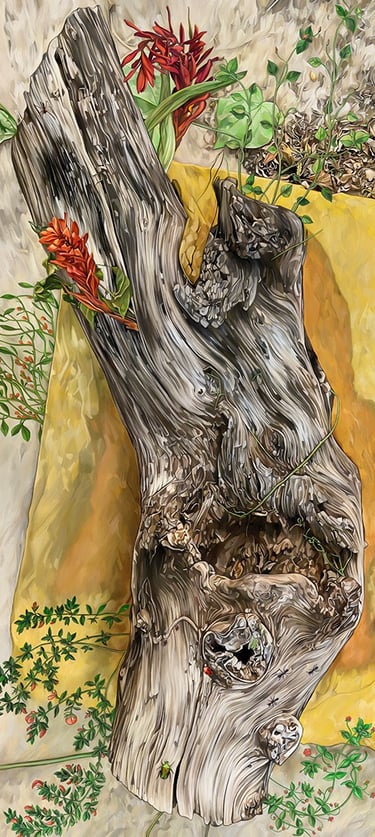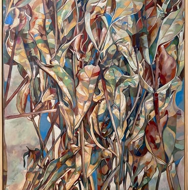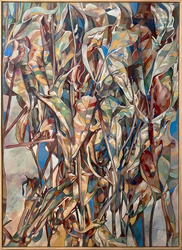 Uma reverência ao sagrado que fala sobre o ciclo de vida e morte e usa como referência imagens de plantas ressecadas e retorcidas, mas que carregam em si uma vitalidade e força só à espera do olhar. "Gosto desse diálogo entre a pintura e as novas tecnologias que trazem outras possibilidades no desenvolver artístico."